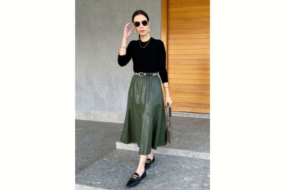 Se você é adepta do estilo feminino e romântico, o mocassim também pode ser uma ótima opção para compor um look com saia midi. Opte por um mocassim em cores neutras, como nude, marrom ou preto para manter o foco na saia. Essa combinação traz um ar delicado e ao mesmo tempo profissional.