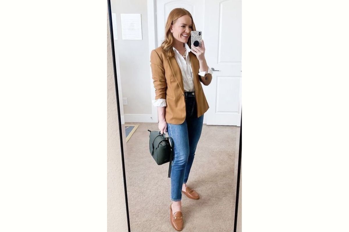 O mocassim caramelo é uma escolha perfeita para trazer um toque de cor e calor ao ambiente de trabalho. Combine-o com um jeans de corte reto para um look casual chic. Escolha uma camisa de tom claro para harmonizar as cores e, para finalizar o visual, adicione um blazer caramelo para dar um toque mais formal e polido.