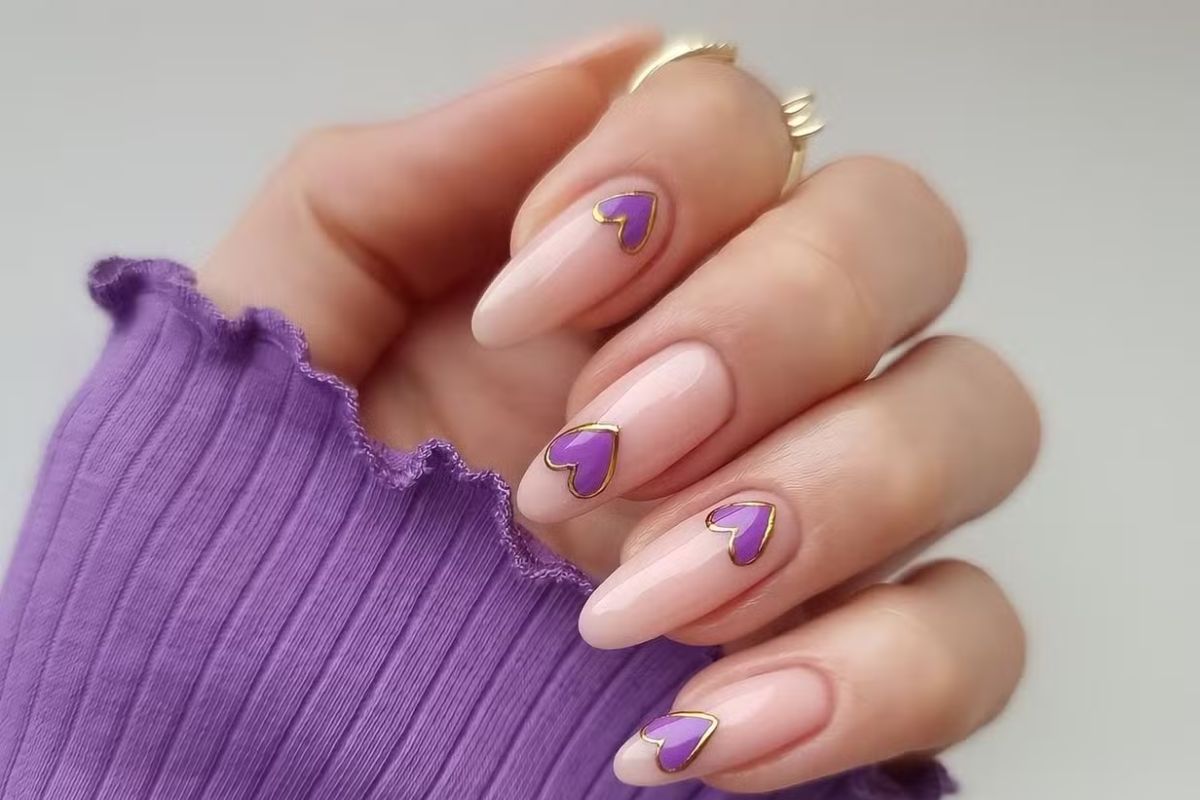 Para as românticas de plantão, por que não incorporar alguns corações roxos nas unhas decoradas? Na cor roxa, essa escolha fica descontraída, leve e feminina. Assim, se você quer algo delicado e divertido, essa é a escolha ideal para um estilo único e cheio de personalidade.
