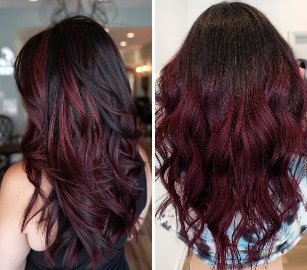 - Ombre Burgundy Balayage: transição gradual do tom escuro da raiz para um vermelho intenso nas pontas, criando um efeito marcante.