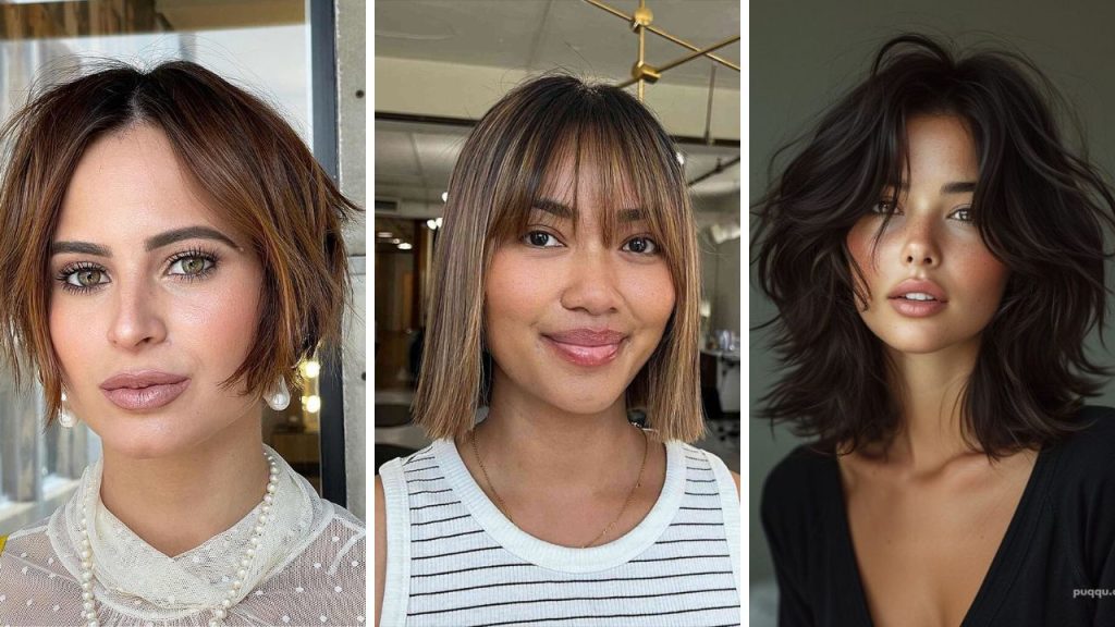 Cortes que terminam na altura do queixo, combinados com franjas muito curtas, tendem a criar uma moldura “dura” ao redor do rosto.