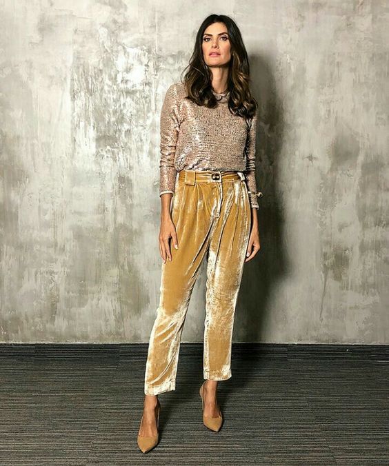 Para aqueles que desejam adicionar um toque de glamour aos seus looks de inverno, as calças com tecidos metalizados também devem bombar este ano.