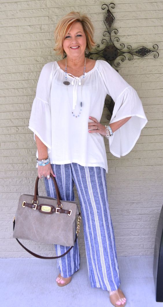 Para um visual mais descontraído após os 50 anos, vale escolher calças pantalonas de tecidos leves e fluidos também.