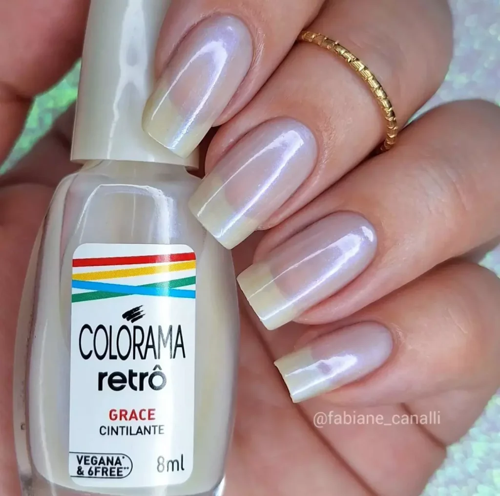 - Grace: Branco cintilante que é clássico e versátil. Pode ser usado sozinho para um efeito único ou como cobertura sobre outras cores. A sua textura brilhante e sofisticada é perfeita para quem ama um toque elegante e atemporal nas unhas.