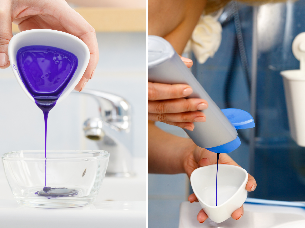Como passar matizador no cabelo. Na foto aparece um frasco de shampoo na cor cinza sendo despejado sobre a mão e uma luva. Seu líquido é roxo. Ao lado uma mulher de tom de pele branco toma banho ensaboando seu cabelo amarelo com o produto roxo.