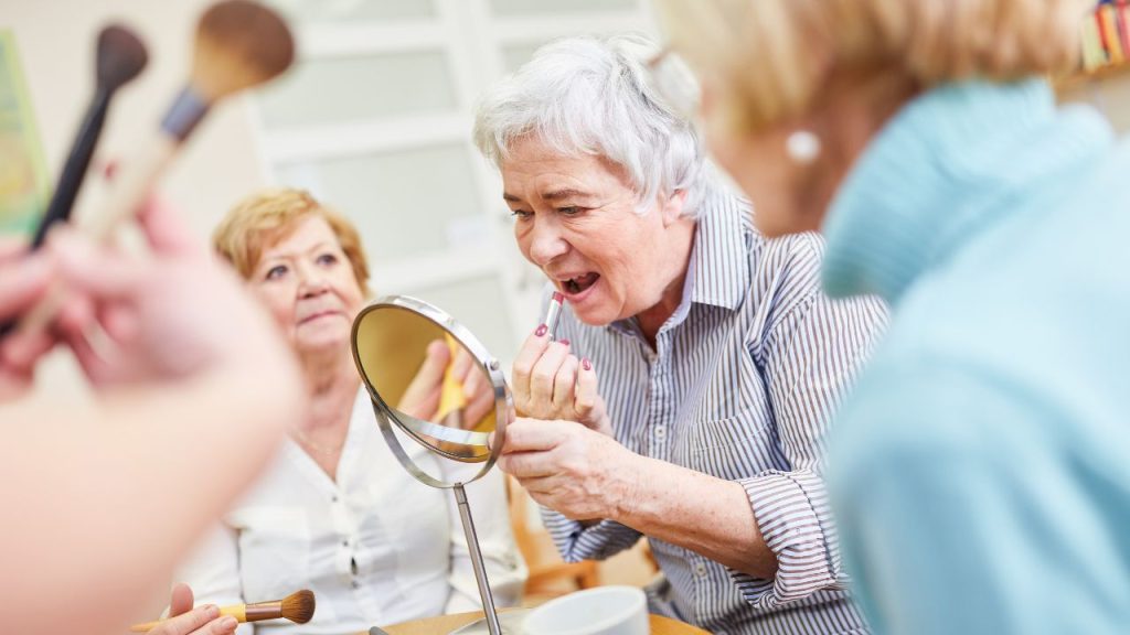 mulheres idosas aplicando maquiagem