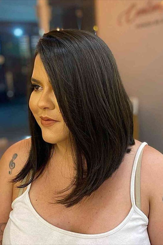 A inclinação do corte direciona o olhar para as maçãs do rosto, destacando essa área e criando um efeito de contorno natural. Essa característica é ideal para quem busca um visual mais jovem e definido, sendo uma escolha popular também entre mulheres maduras que querem rejuvenescer a aparência.