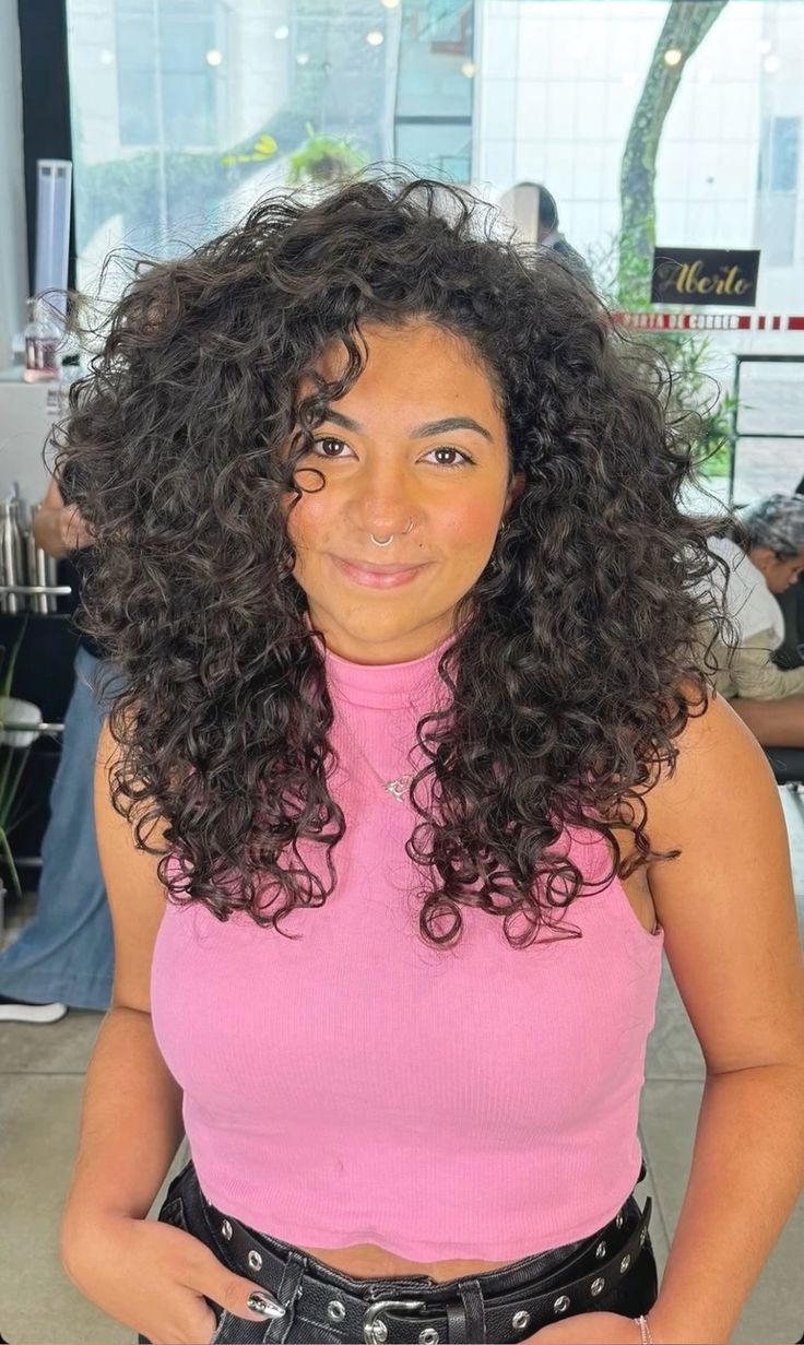 Esse corte valoriza a textura natural do cabelo cacheado, proporcionando um visual leve e cheio de personalidade. Aqui as camadas acabam criadas quase ao topo dos cabelos.