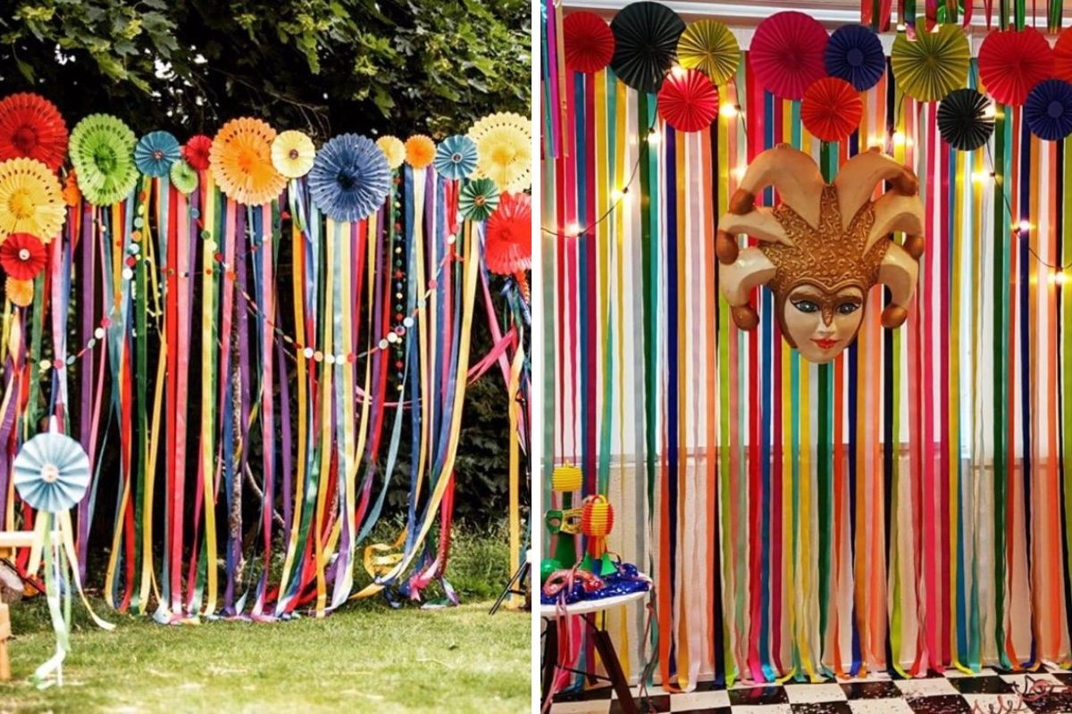 Uma das formas mais impactantes de transformar a decoração para o Carnaval 2025 é investir em painéis de fitas e leques de papel.