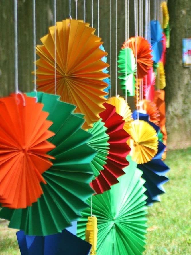 Painéis de fitas e leques de papel também funcionam bem ao ar livre, criando um ambiente descontraído e sofisticado.