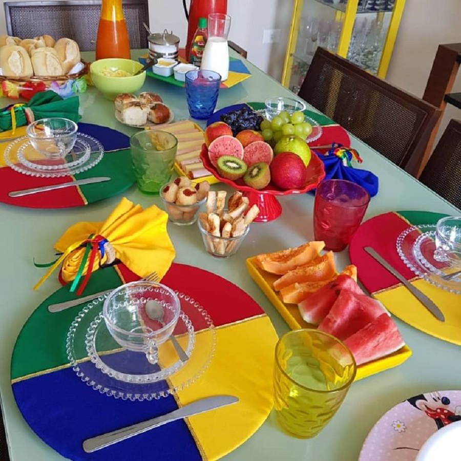 Jogos americanos coloridos, guardanapos dobrados de forma criativa e pequenos acessórios, como máscaras e colares, trazem personalidade ao espaço.