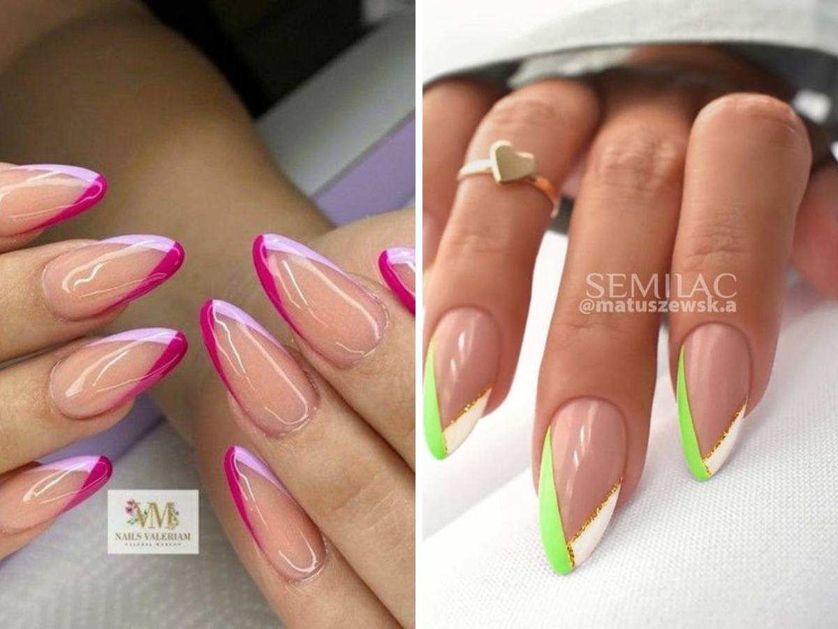 Unha francesinha triangular. Foto mostra duas mãos com unhas diferentes. Uma é clássica com a ponta em triângulo branco. Outra traz uma unha rosa com francesinha no mesmo formato