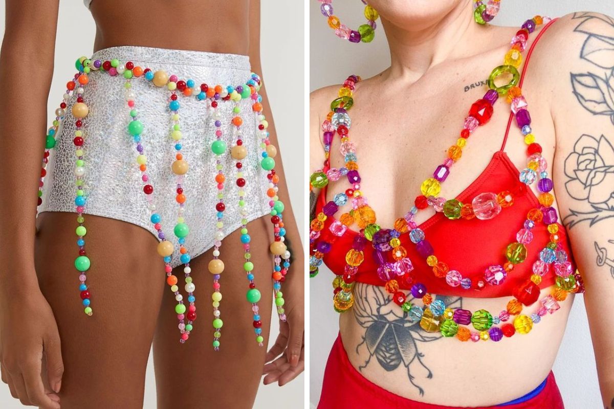 Miçangas, pérolas e elementos artesanais aparecem tanto em colares e pulseiras quanto em roupas e tops decorados. Essa tendência handmade traz um toque nostálgico e despojado para a folia.