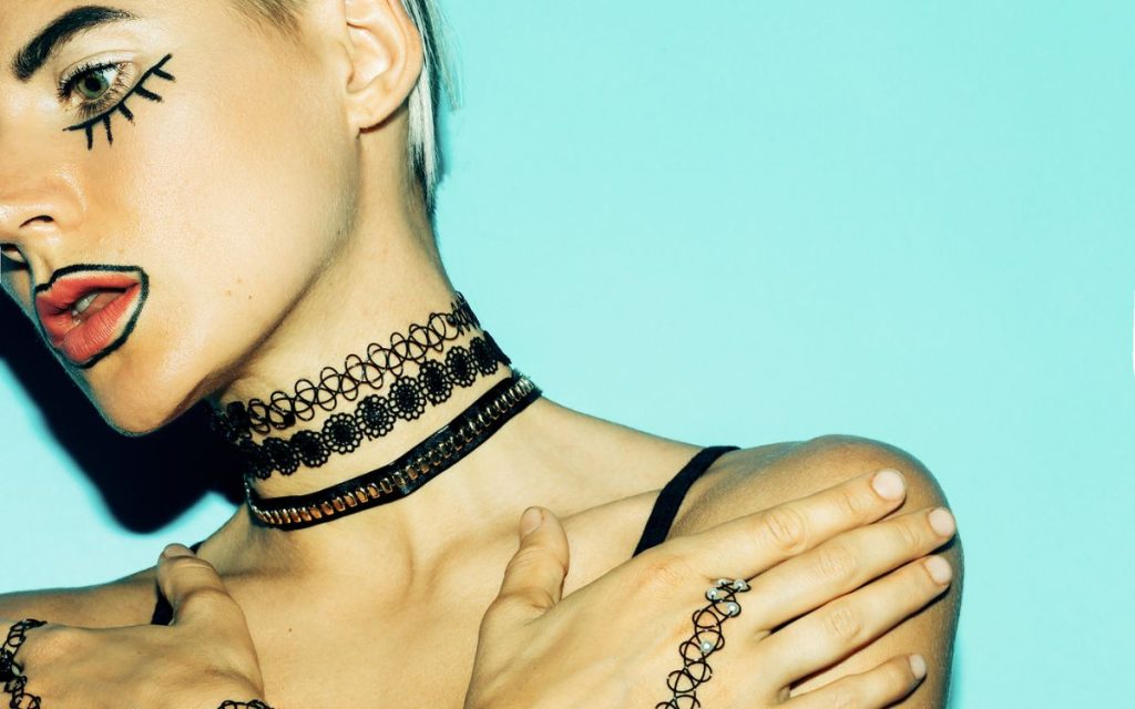 O modelo mais clássico de gargantilha dos anos 90 sem dúvidas é a tatoo choker, essa “redinha” que parece uma tatuagem tribal e fica unida ao pescoço.