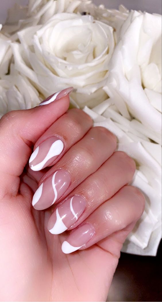 Uma das tendências mais criativas de 2025 é o uso de desenhos abstratos nas unhas, com o branco como pano de fundo.