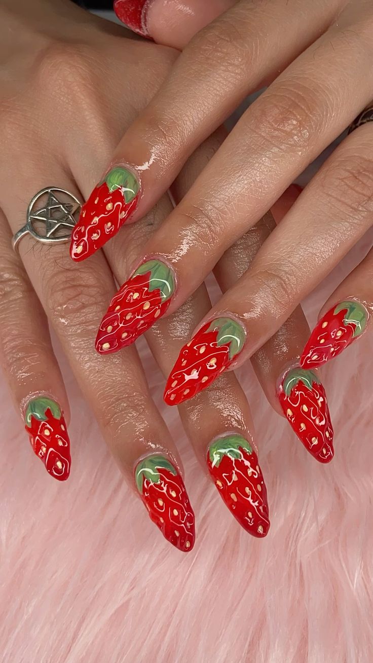 Morangos, abacaxis, kiwis, e até melancias podem adornar as unhas, criando uma manicure fresca e vibrante. As frutas podem ainda acabar desenhadas de forma realistas ou estilizadas, dependendo do efeito desejado.