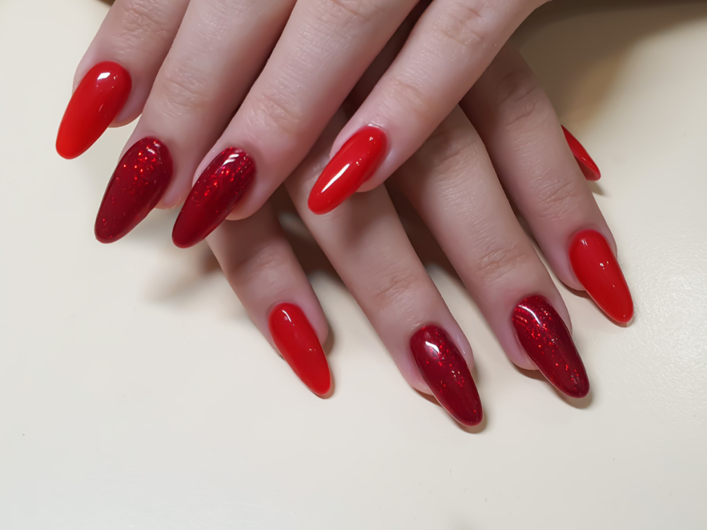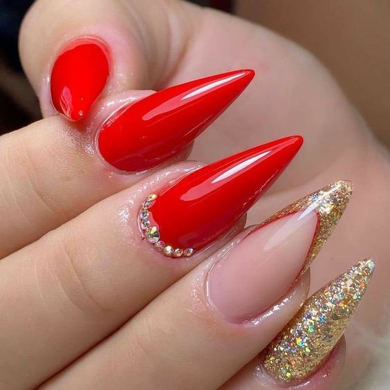Unhas vermelhas com Acrigel em formato Stiletto e glitter dourado