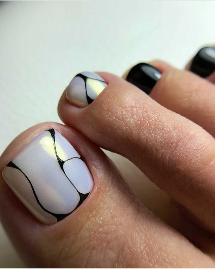 Para quem prefere algo mais discreto, mas ainda assim moderno, o minimalismo gráfico nas unhas dos pés é uma ótima alternativa.