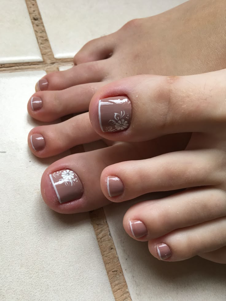 O traço branco é fino, e os desenhos florais brancos no dedão e segundo dedo deixam a arte mais personalizada. Uma ideia ótima pra quem curte detalhes mais artísticos, mas ainda dentro de uma linha discreta.