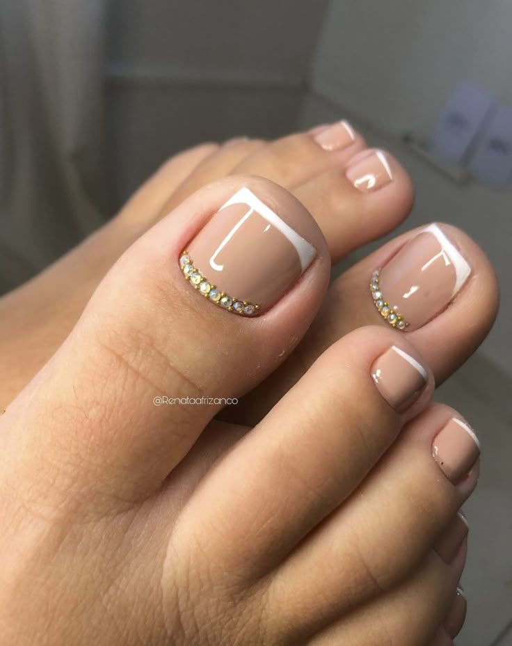 Aqui, o fundo é nude puxando pro bege e o traço branco vem bem marcado. O toque especial fica por conta das pedrinhas douradas aplicadas na base da francesinha do dedão e do segundo dedo.
