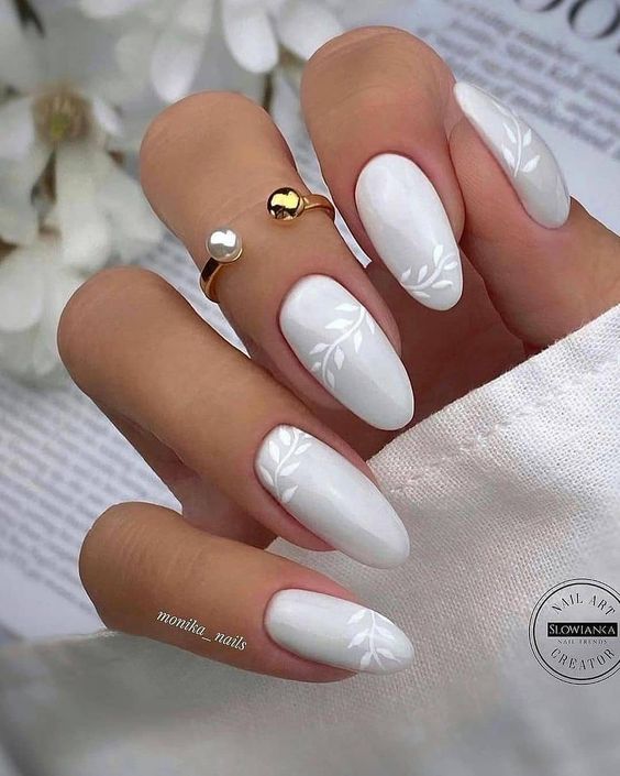 Se você adora algo mais charmoso, as unhas brancas com ramos de flores são uma excelente pedida.