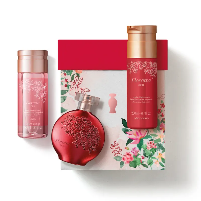 Uma explosão de paixão e energia, o Kit Floratta Red é ideal para as mães que irradiam vitalidade e amor pela vida. Considerado um lançamento entre os kits de dia das mães do Boticário, o conjunto traz três produtos em especial sendo: perfume, loção hidratante corporal e óleo desodorante corporal.