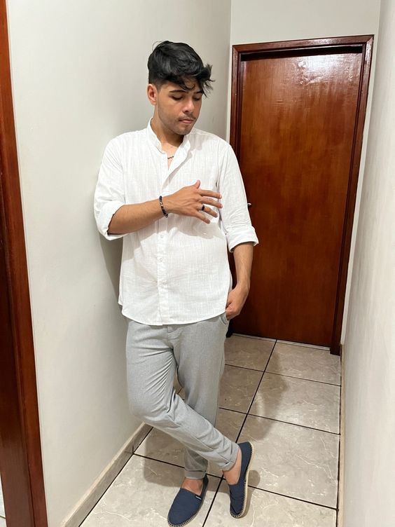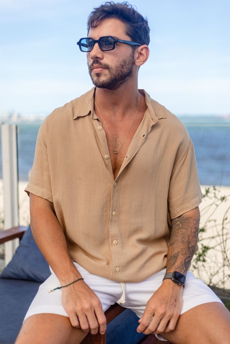 Começamos nossa lista de inspiração com o clássico camisa e shorts. A combinação está entre as mais clássicas do look masculino no ano novo. Aqui normalmente ela traz um visual todo branco ou para diferenciar uma camisa de cor areia perfeita para a ocasião.