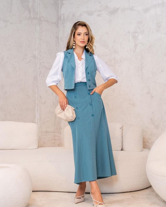 Assim, para um visual feminino e refinado, aposte em um colete de alfaiataria combinado com uma saia midi fluida e uma blusa delicada. Adicione sapatos de salto e acessórios minimalistas para um toque final elegante.