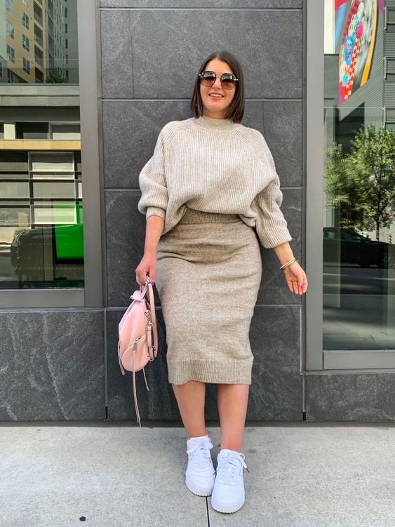 Os vestidos de malha criam looks comfy bem interessantes e trazem uma escolha prática e estilosa para o inverno. Eles se ajustam ao corpo de maneira confortável e acabam usados sozinhos ou com meia-calça com botas ou tênis por mulheres mais maduras.