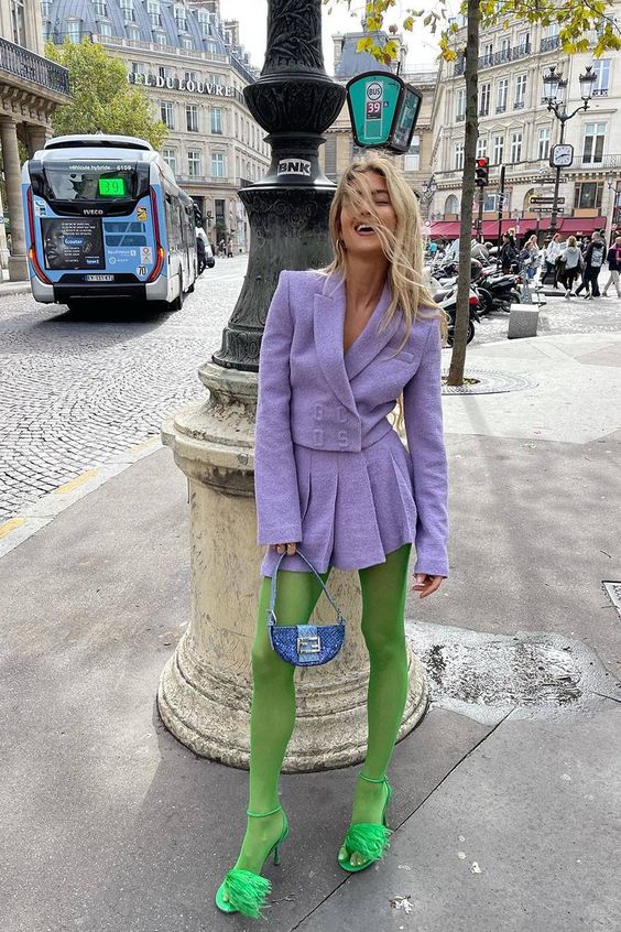 Para aderir com estilo a essa trend, algumas dicas são essenciais. Uma delas, por exemplo, é apostar em looks monocromáticos, onde a meia-calça colorida se torna o ponto focal, criando uma composição elegante e harmoniosa.