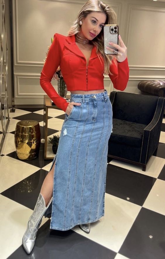 5. Caso prefira, a saia jeans longa também combina com o look de Natal. Aqui combine uma camisa vermelha e botas médias prateadas