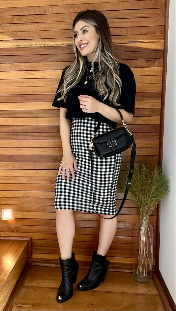 2. Para um look mais confortável, no entanto, aposte na saia midi quadriculada e botas de cano baixo e sem salto pretas