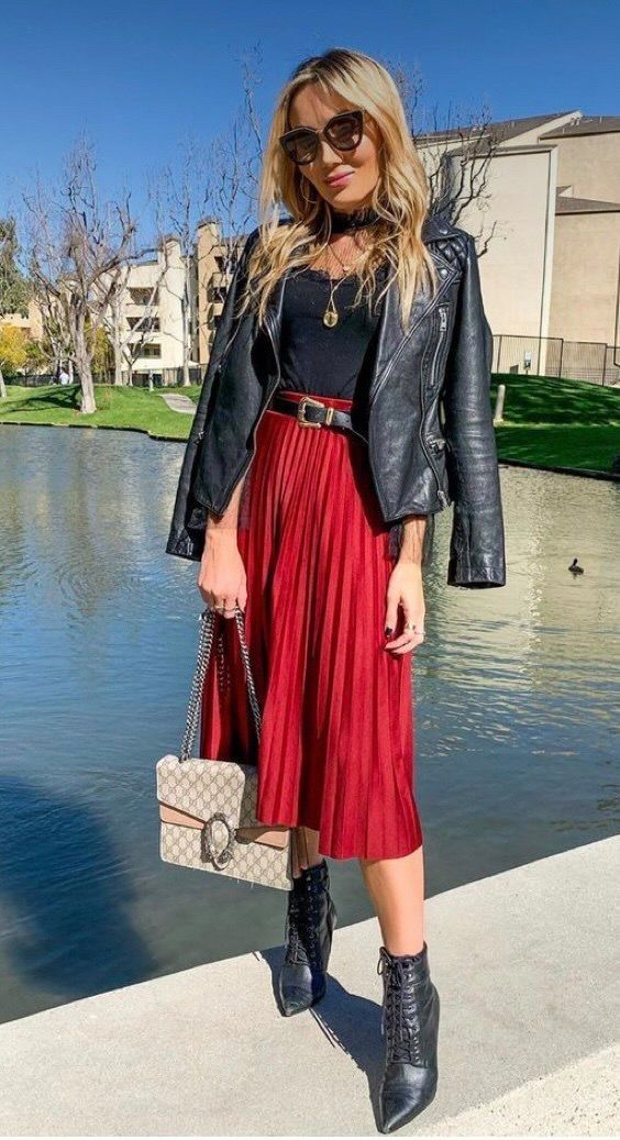 1. Saia Midi sanfonada de cor vermelha e bota preta de bico fino com cadarços fica super elegante