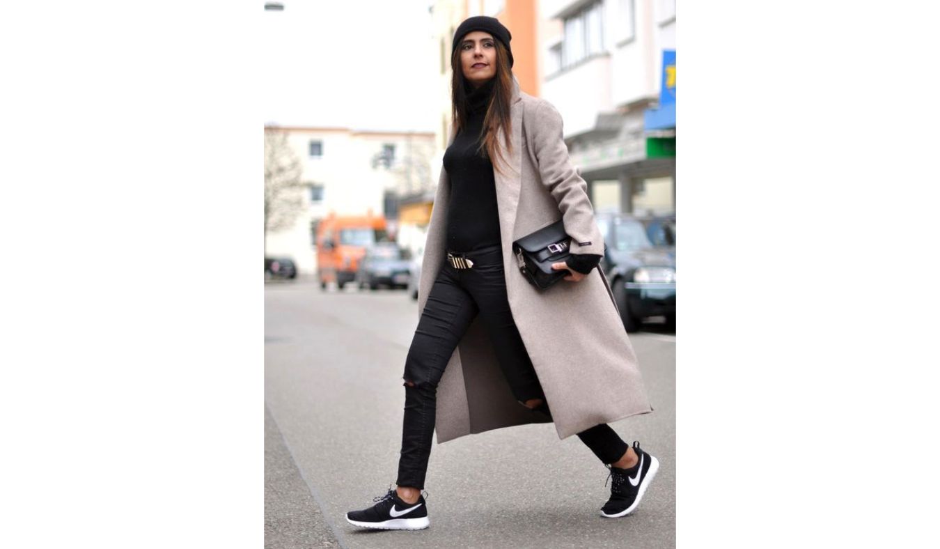 Outra maneira de arrasar em looks com tênis preto no inverno é combinar uma base preta básica (uma calça jeans e uma blusa de malha, por exemplo) com um sobretudo contrastante.