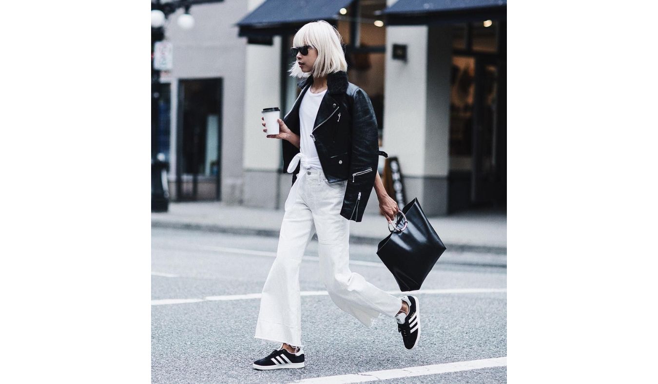 Agora, imagine um look total white com o charme contrastante de um tênis e uma jaqueta pretos. Esta é uma opção perfeita para os dias de inverno.