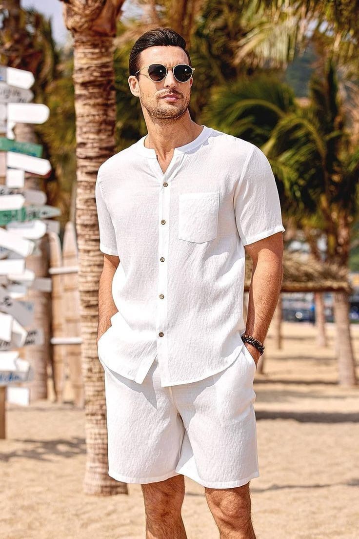 1. Look clássico com camisa e bermuda branca ainda será um dos mais escolhidos pelos homens em 2024