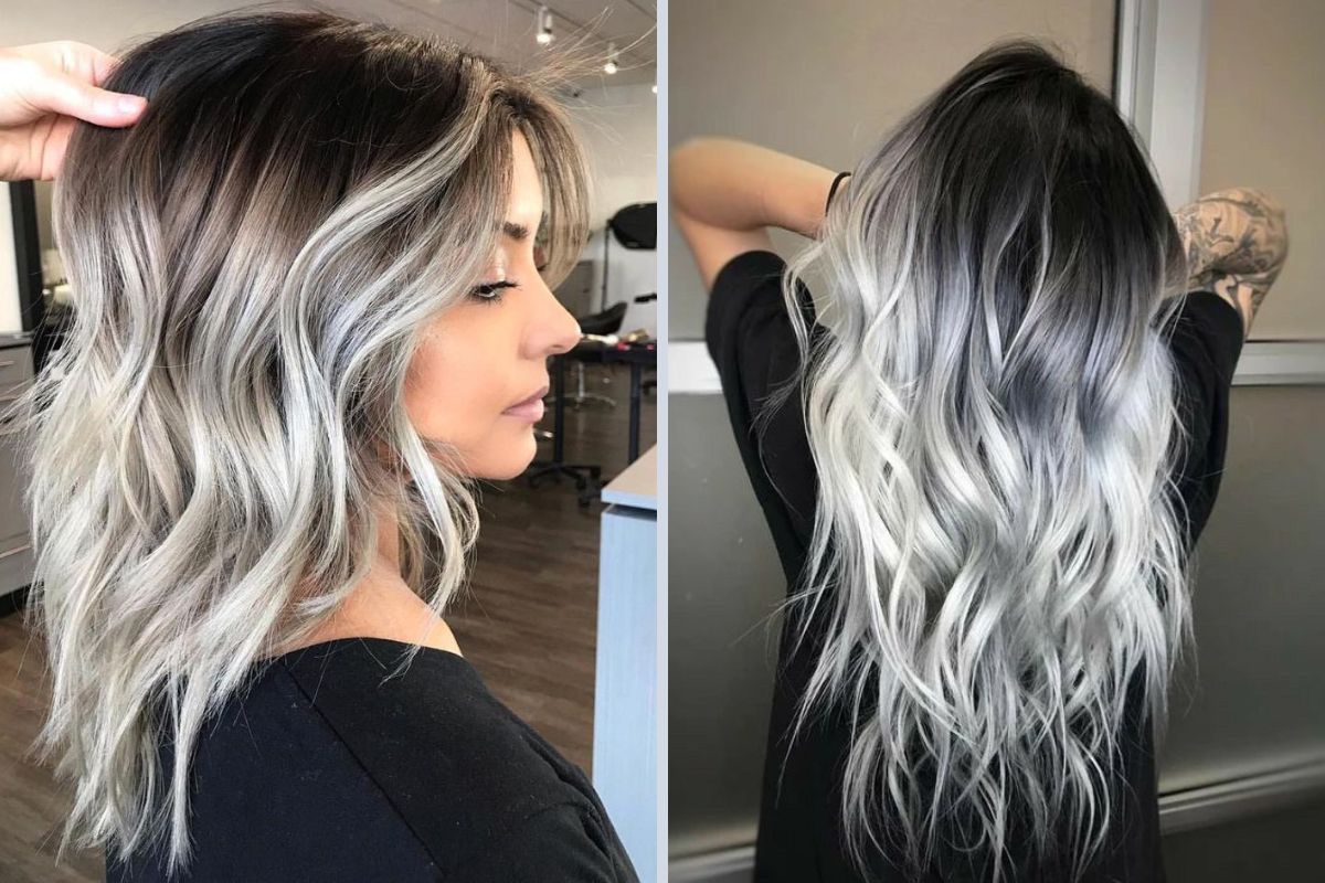 O ombrê platinado com raiz esfumada escura é uma escolha audaciosa que combina o contraste entre a raiz escura e o comprimento platinado.
