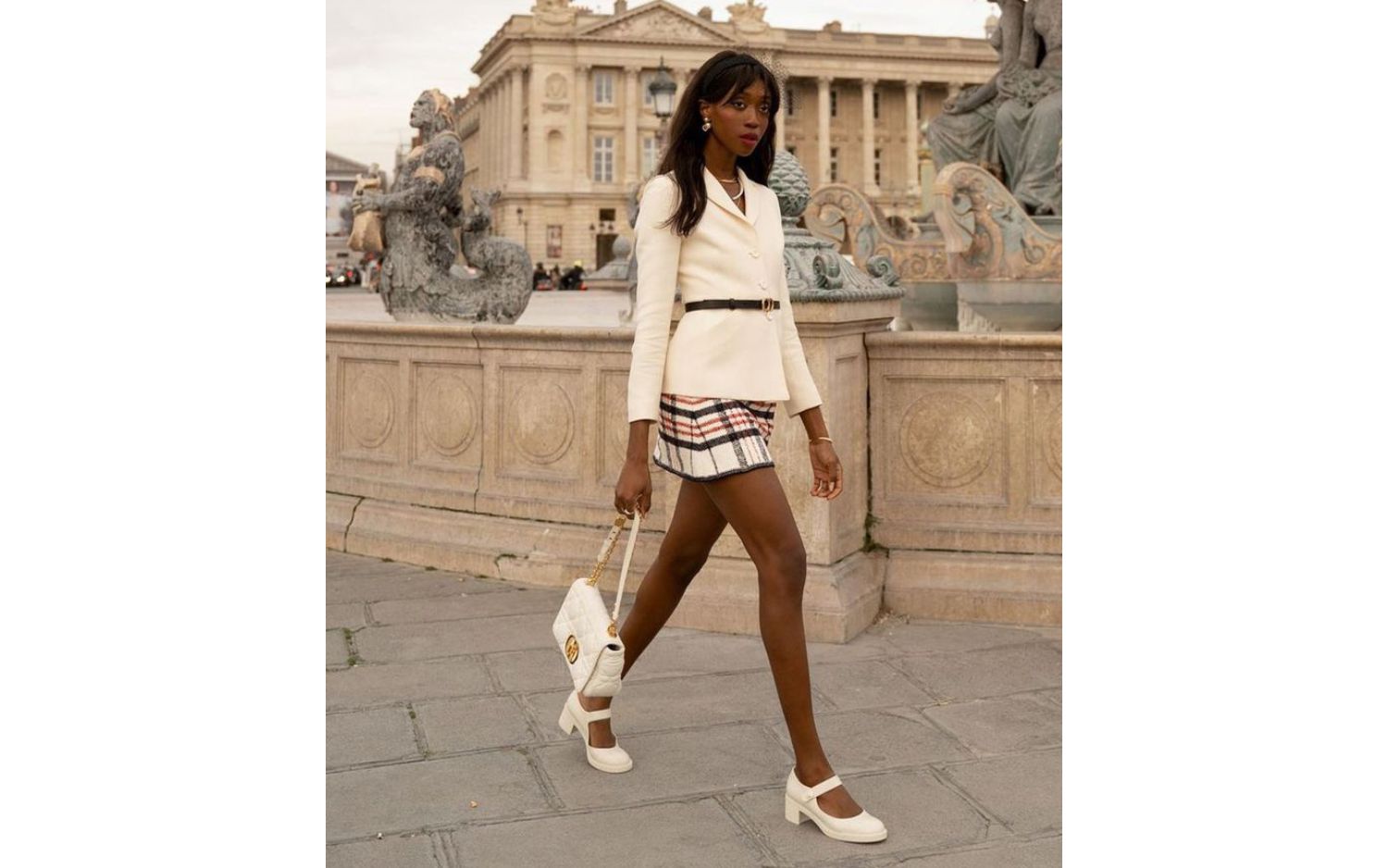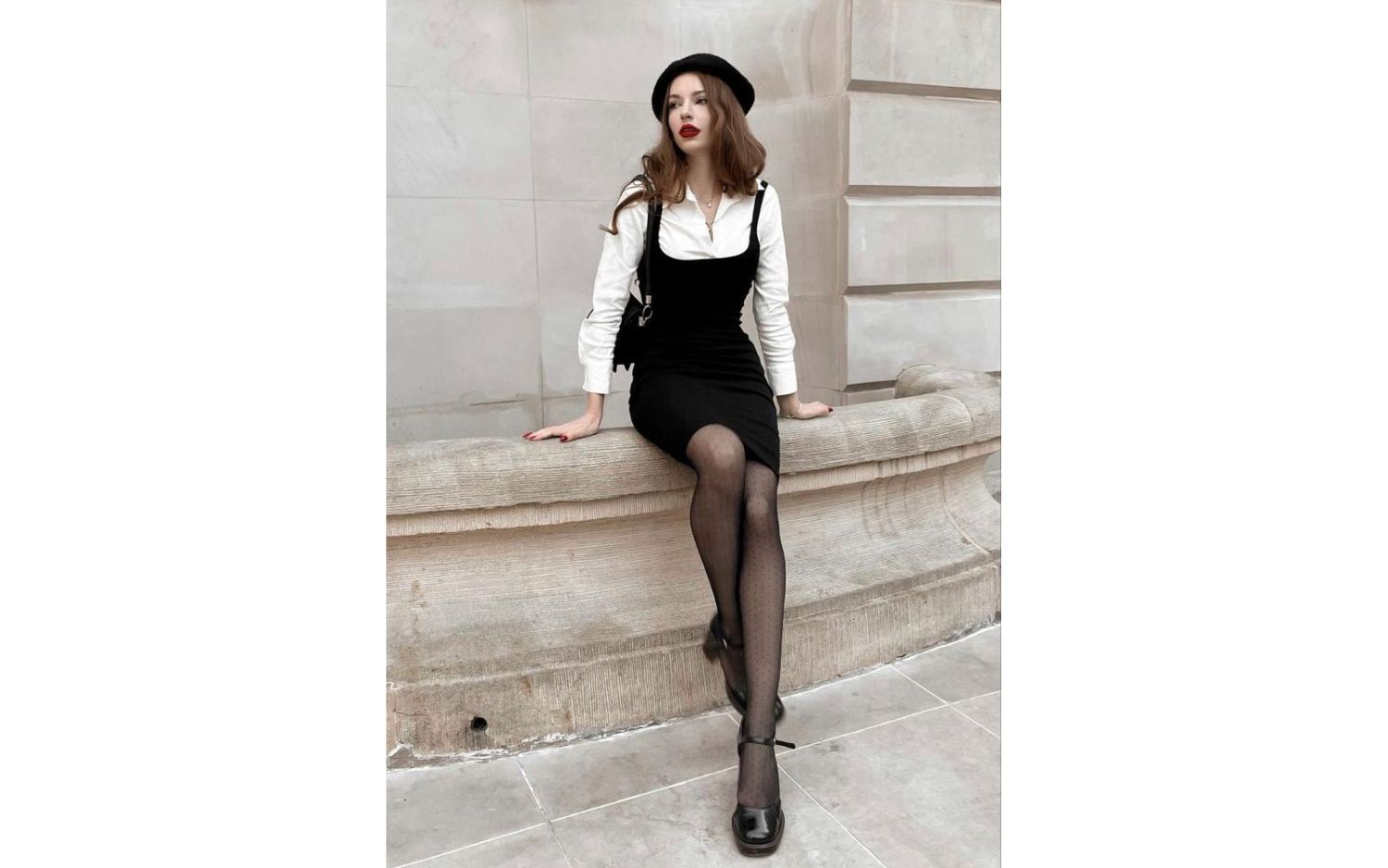 A sobreposição de vestido preto e camisa, nunca sai de moda, mas é fato que nem todo mundo usa. Assim, essa ainda é uma combinação inusitada que traz muita jovialidade. Para completar, a clássica boina francesa na cabeça, remetendo aos tempos passados da Chanel e o sapato na versão preta nos pés.