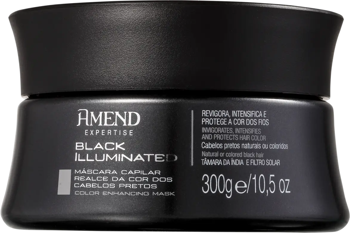 Outra sugestão entre as marcas de matizador preto azulado vem da Amend. A versão Black Illuminazed protege o desbotoamento dos fios, assim como traz ingredientes naturais, como Tâmaras.