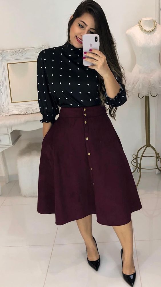Outra opção incrível e que estará em alta na moda evangélica em 2024 será o tecido com bolinhas. Dessa forma, a estampa será uma das queridinhas das mulheres e poderá vir tanto nas camisas, como saias. O visual ficará incrível.