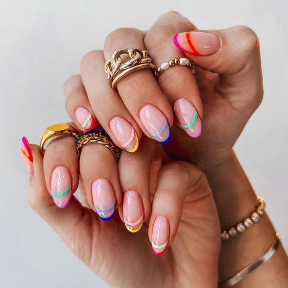 Por fim, não podemos terminar esse post sem falar das francesinhas coloridas. Assim como outras opções acima, ela também está entre os modelos modernos para se apostar em 2024. Também pode trazer várias cores ou uma só para compor o look. A grossura do traço é um ponto alto da nail art. Portanto, inspire-se e arrase na nail art!