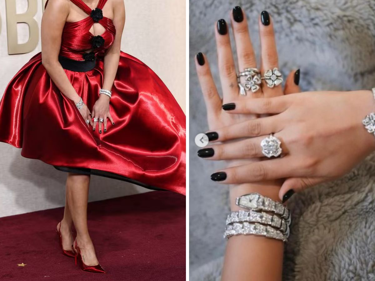 Embora o cenário tenha sido de grandes nail arts clarinhas no Globo de Ouro de 2024, Selena Gomez trouxe ao evento lindas unhas pretas. A ideia, no entanto, veio justamente para combinar com seu vestido vermelho com saia transversal, o qual também trouxe detalhes em preto. A combinação realmente ficou um show a parte.