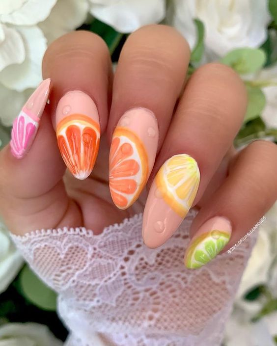 As frutas são um clássico do verão e também uma ótima opção para Nail Art. Você pode usar frutas desenhadas com esmalte. Para fazer o desenho, no entanto, você pode usar esmaltes de cores diferentes e um pincel fino ou se preferir apostar em adesivos prontos retratando o fruto como melancia, morangos, laranjas, entre outros.