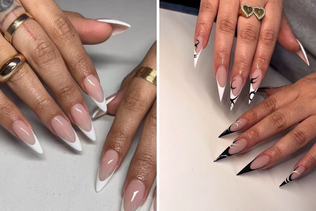 Na prática, essa união traz um contraste marcante entre o estilo ousado das pontas afiadas e a delicadeza clássica das francesinhas, criando um visual que agrada tanto quem busca sofisticação quanto quem prefere um toque moderno.