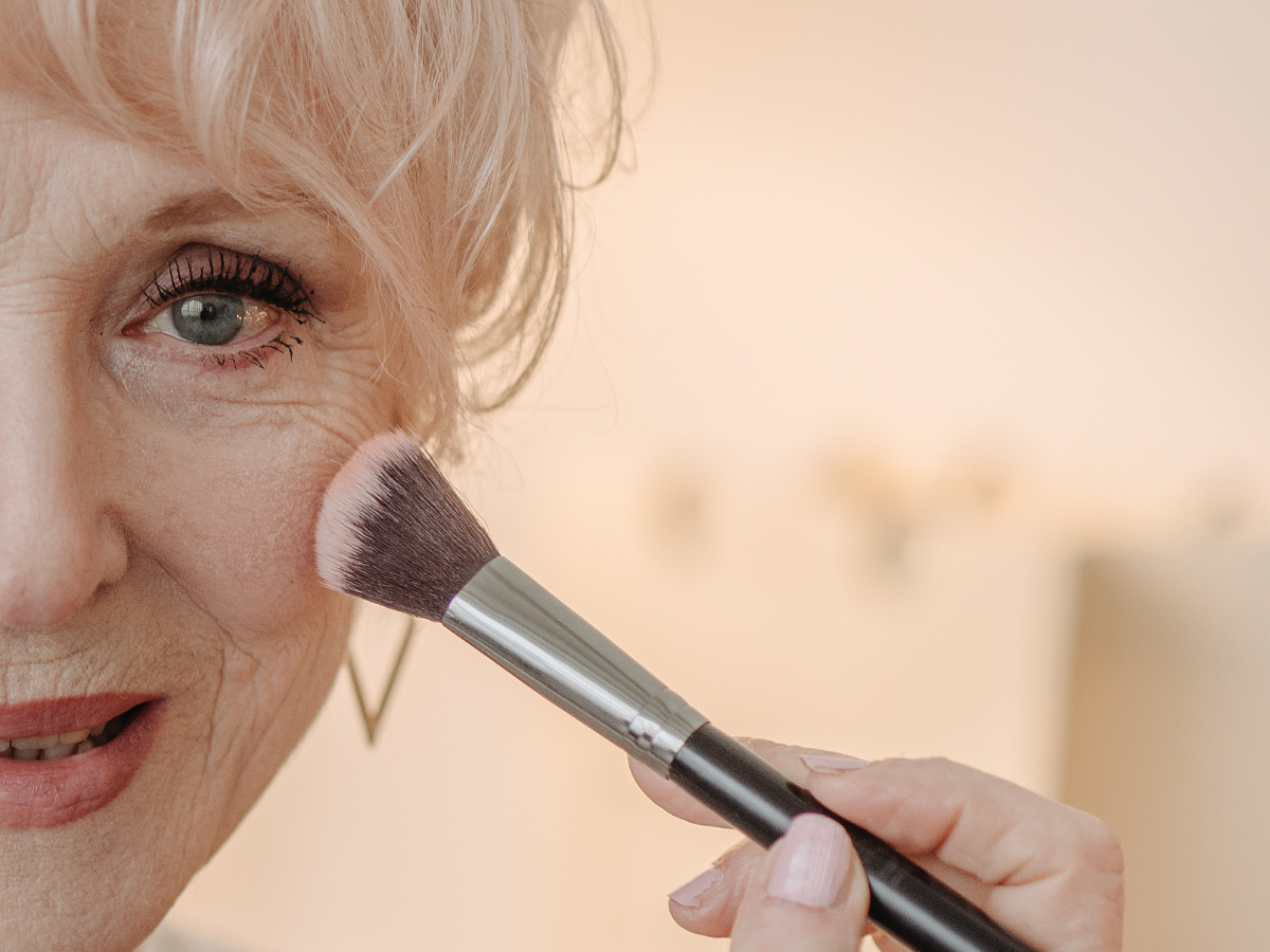 Uma dica é sorrir ao aplicar o produto, afim de identificar o local mais alto da maçã do rosto. Assim, evite blushes com acabamento cintilante e prefira fórmulas com acabamento matte ou acetinado, que são mais adequadas para peles maduras, pois não acumulam nas linhas finas.