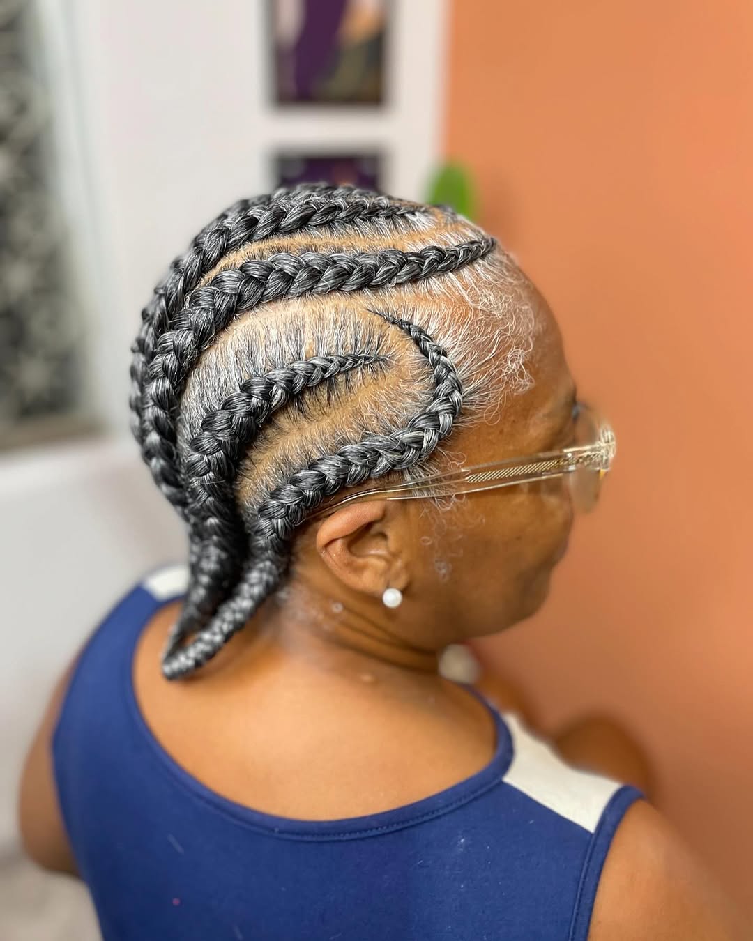 A trança nagô é um penteado que funciona perfeitamente em cabelos grisalhos. Feita bem rente ao couro cabeludo, ela tem um efeito moderno e cheio de personalidade. Assim, esse penteado proporciona um resultado moderno, elegante e com muita presença.