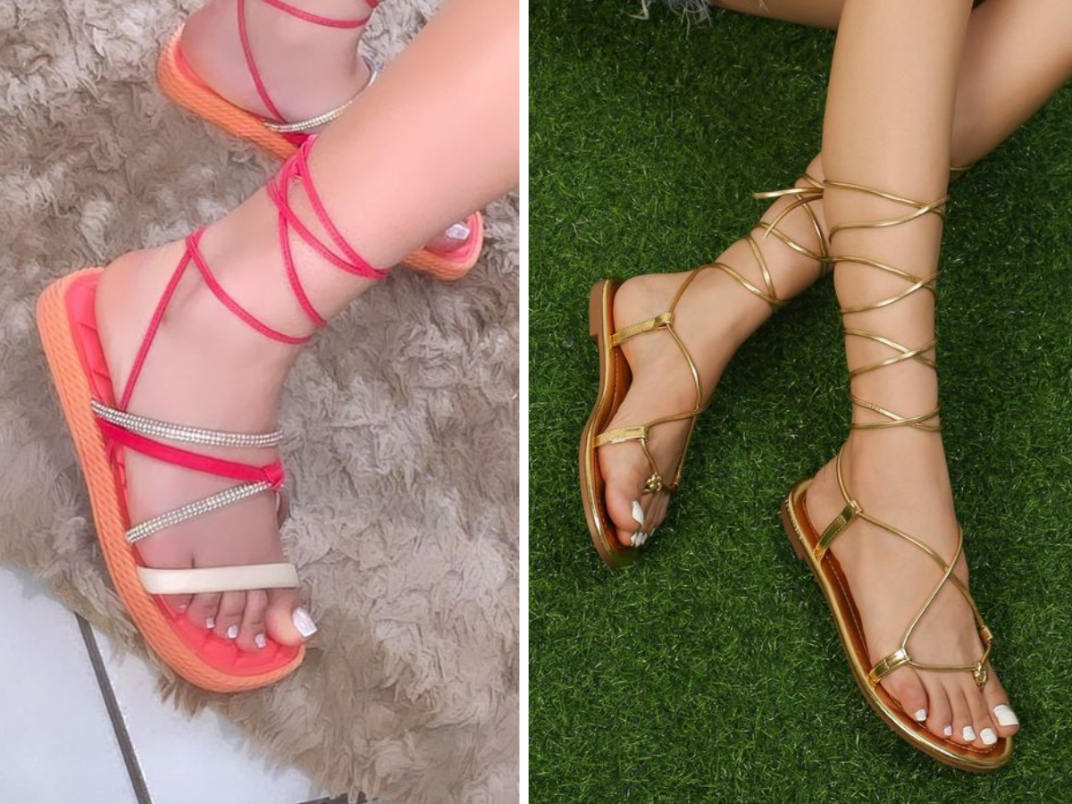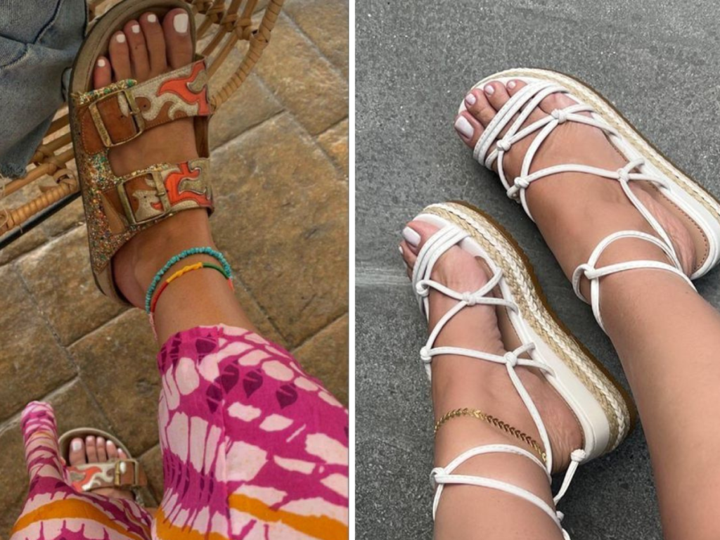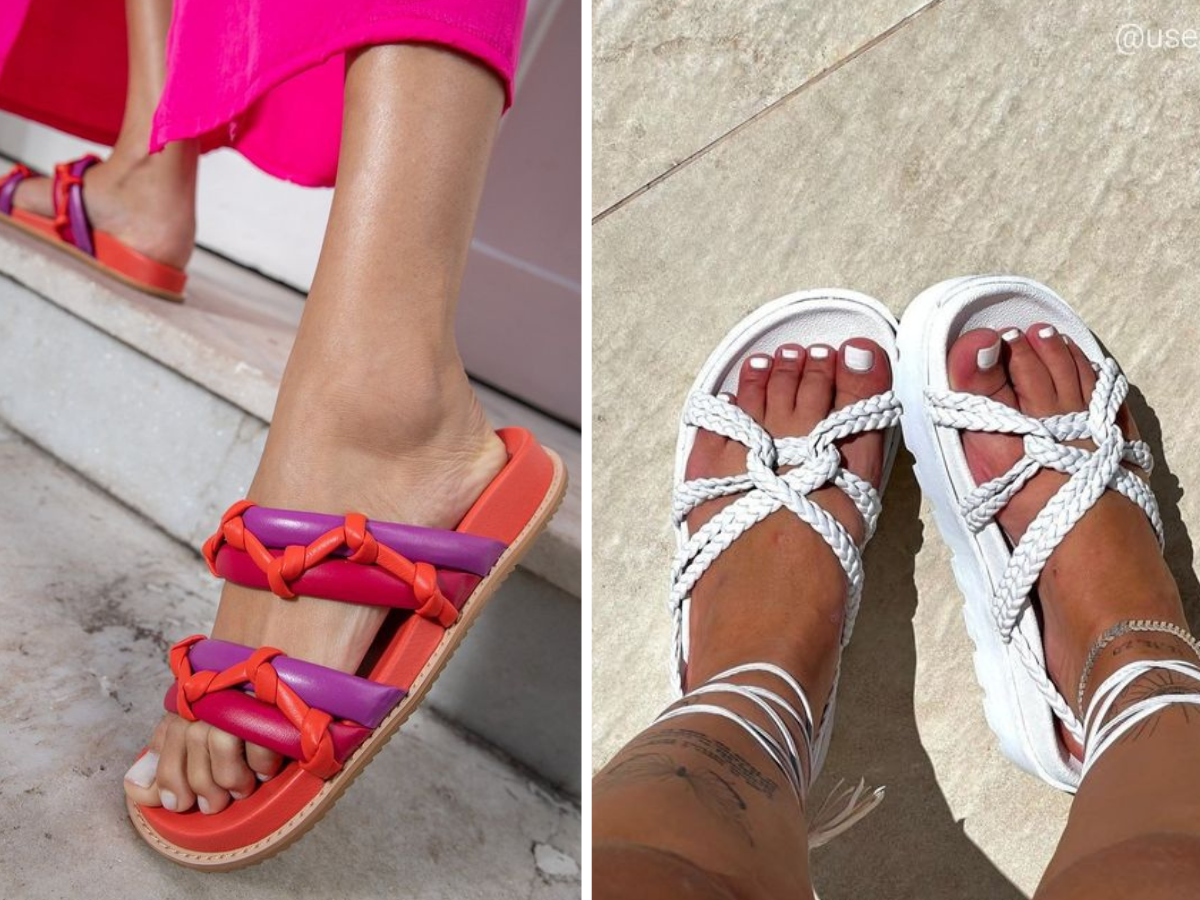 Papete feminina de 2024. Foto mostra dois tipos de papetes, sendo a do lado esquerdo um modelo com fiverlas e estampas de cor laranja e verde musgo. A outra papete, do lado direito, é branca com amarrações finas.