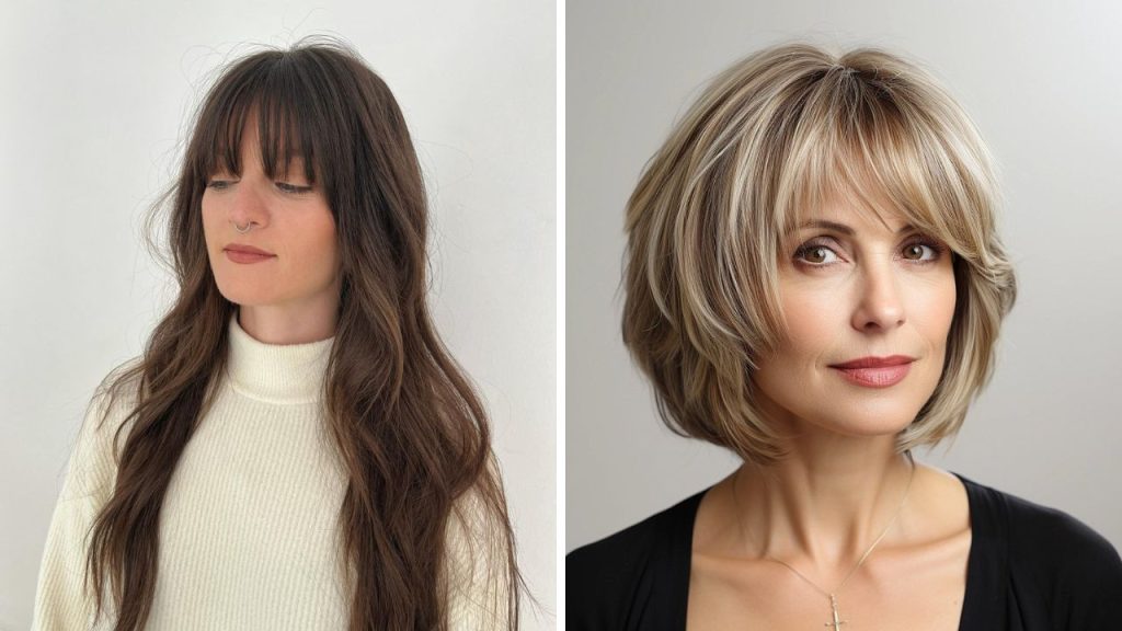 Um corte longo com franja é ideal para quem deseja manter certa extensão nos fios, mas precisa de um estilo que disfarce áreas de escassez, especialmente no topo da cabeça.