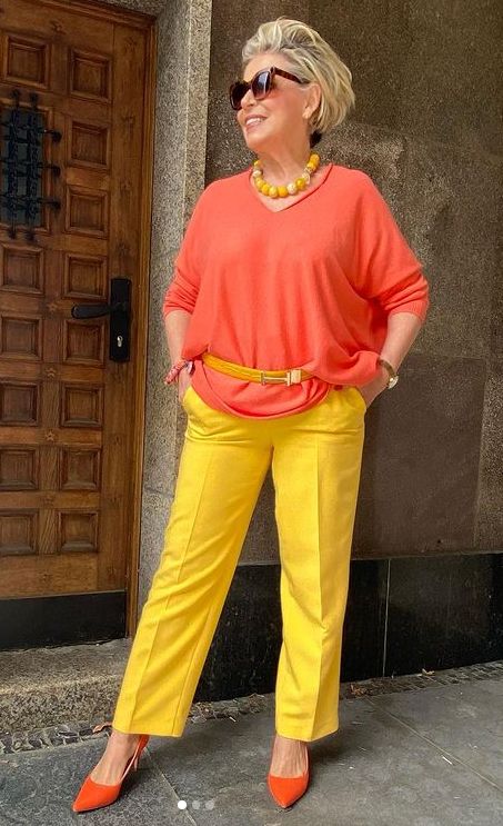 A calça pantalona em cor neutra, combinada com uma blusa de cor vibrante e uma sandália de salto quadrado, também está entre as roupas ideais das mulheres de 50 anos, pois proporciona conforto e modernidade.