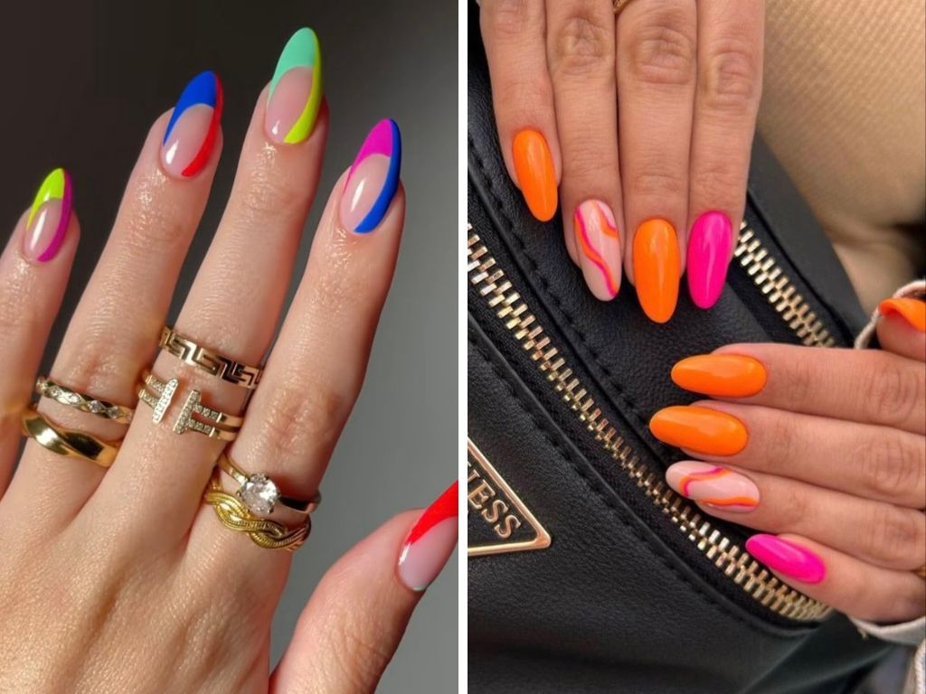 Na imagem acima, podemos ver um exemplo desse estilo inovador: unhas em formato amendoado com pontas assimétricas e tons vibrantes como azul, rosa, verde-limão e vermelho.